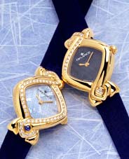 timepieces in gold, with blue satin bracelets.