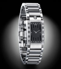 Contoured, comma-shaped stainless steel case with 12 diamond