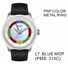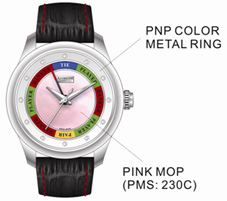 Basée sur le jeu de cartes – 4 résultats possibles – ‘player’ - ‘banker’ – ‘pair’ and ‘tie’. cette montre a un mouvement modifié qui permet de stopper aléatoirement dans n’importe laquelle de ces positions. Elle est assortie d’un bracelet en cuir de crocodile avec boucle déployante en acier.