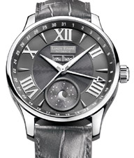 Cadran gris ou argenté index argentés aiguilles avec Superluminova date au centre, phase de lune à 6h, jour et mois à 12h (Phase de Lune) grande date à 12h et second fuseau à 6h (GMT – Grande Date)