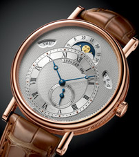 Dial: in silvered 18K gold, hand-engraved on a rose engine. Individually numbered and signed Breguet. Chapter ring with Roman numerals off-centered at 6 o'clock, engine-turned in a cross-weave basket pattern. Open-tipped Breguet hands in blued steel. Age and phases of the moon at 12 o'clock. Date at 2 o'clock. Day of the week at 10 o'clock. Running seconds at 5 o'clock.