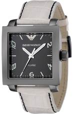 square ionized steel case with black dial and ivory leather strap,