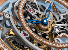 • Mouvement: squeletté, avec tourbillon, construit autour d’une platine minérale