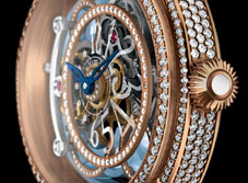 de la dernière nouveauté de la collection Millenary. Platine en calcédoine ajourée, mouvement squeletté agrémenté d’un tourbillon et d’anneaux sertis de diamants, boîtier ovale en or rose entièrement serti et bracelet en galuchat, telles sont les principales caractéristiques du Tourbillon Millenary Calcédoine.