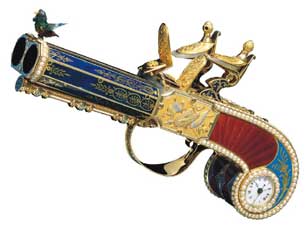 L'inoffensif Duel Amoureux de Moulinié, Bautte & Cie (Genève, vers 1805, Inv. 01 a+b) est constitué d'un paire de montres-objets en forme de pistolets à silex qui, actionnés, ne répandaient que le parfum issu d'une fleur surgissant au bout de leur canon. Une montre est cachée dans l'arrondi de leur crosse. |