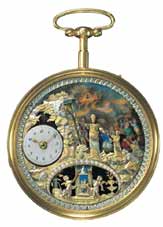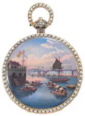 Dix ans plus tard, c'est au tour de la Chine d'accueillir – via, d'abord, les commerçants britanniques – le savoir-faire horloger genevois, dont le prestige atteindra des sommets au 18 e siècle, sous le règne de Ch'ien Lung. Empreinte d'un exotisme discret qui en fait toute la saveur, les montres dites «chinoises", produites à Genève, ont la curieuse particularité d'aller par paires. De cette étonnante exigence chinoise, les horlogers genevois tireront le plus astucieux parti en poussant la sophistication jusqu'à réaliser des pièces jumelles au décor inversé. |