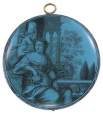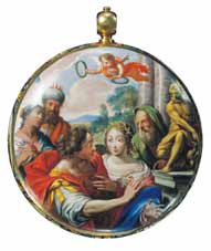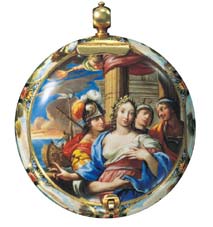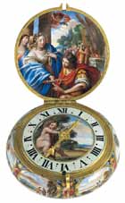 ![]() Flore et Cupidon Montre bassine en "grisaille" sur fond "bleu mourant" - Henry Grendon, Londres. Email attribué à un atelier huguenot établi à Londres - vers 1645-50. |