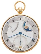 ![]() "Répétition perpétuelle à secondes" Montre à remontage automatique construite sur le principe des garde-temps avec répétition à quarts "à toc", date, phases et âge de la lune et indication de réserve de marche - Abraham-Louis Breguet, Paris. Vendue le 16 avril 1829, au banquier parisien, le baron Anselme de Rothschild. |