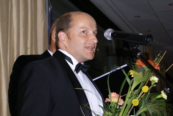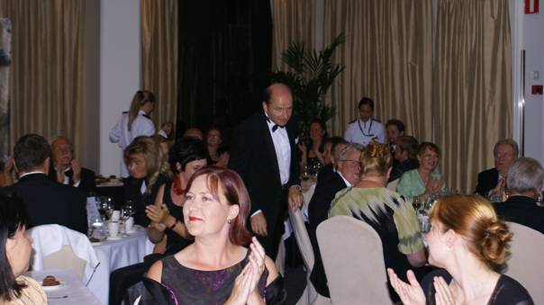 Kari Voutilainen winding his way through the tables of applauding guests,